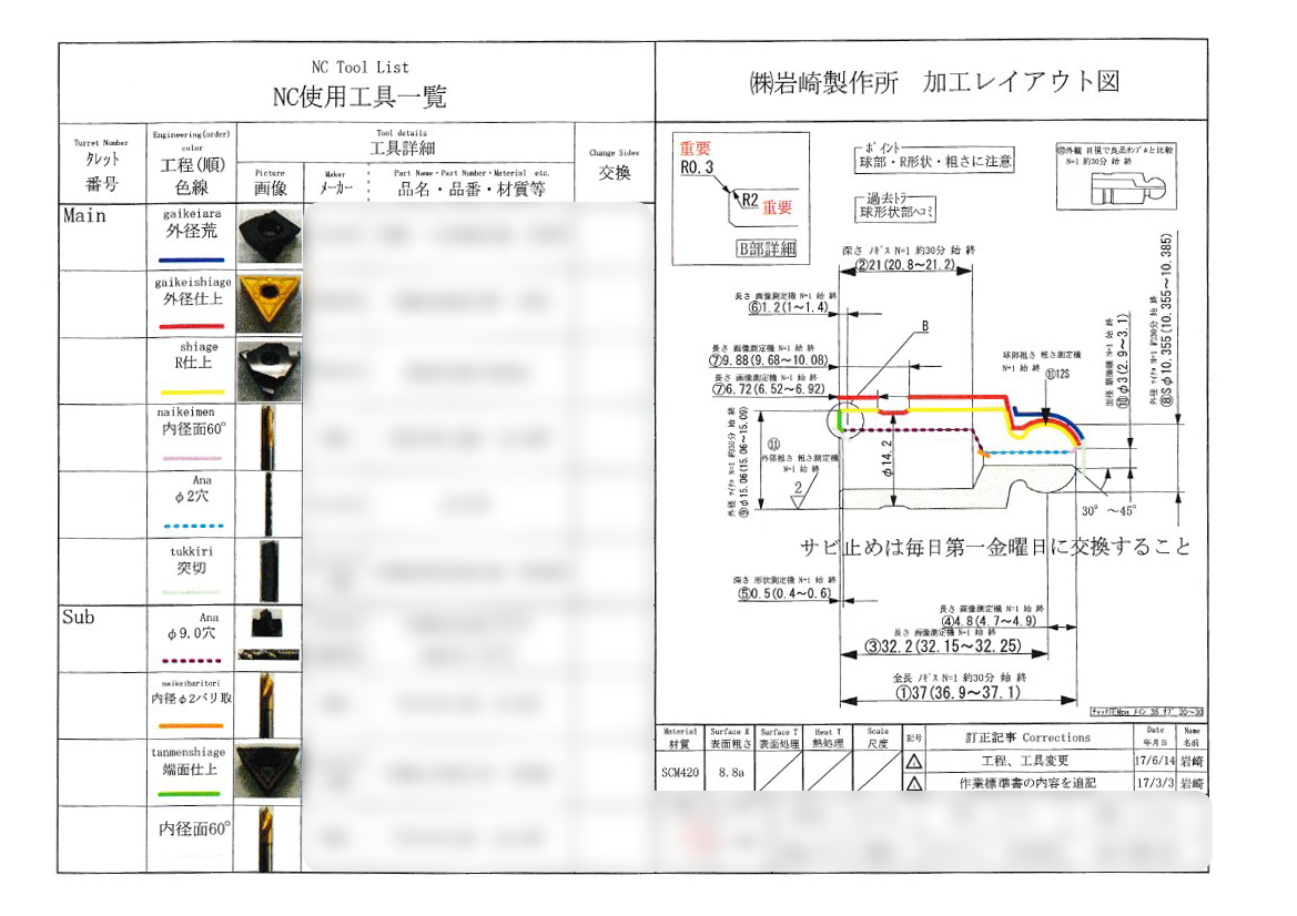 「荒加工は赤」「仕上げは緑」。文字を読まずとも直感的に工程を理解できるユニバーサルデザインです。